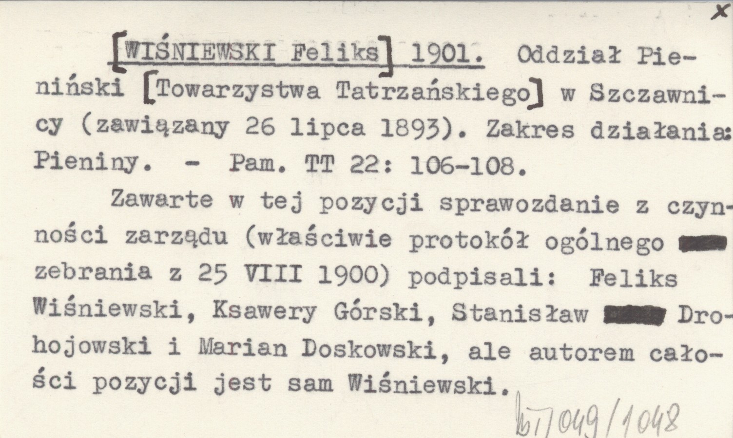 Pamiętnik Towarzystwa Tatrzańskiego, 22: 106-108. Zawarte w tej pozycji sprawozdanie z czynności zarządu (właściwie protokół ogólnego zebrania z 25 VIII 1900) podpisali: Feliks Wiśniewski, Ksawery Górski, Stanisław Drohojowski i Marian Doskowski, ale autorem całości pozycji jest sam Wiśniewski.