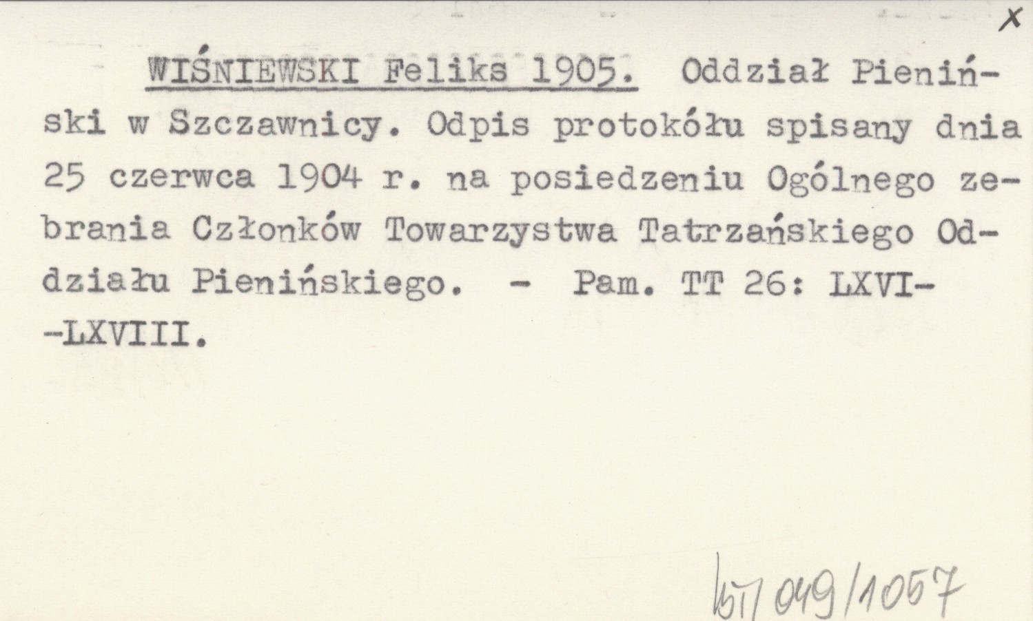 WIŚNIEWSKI Feliks 1905 Oddział Pieniński w Szczawnicy. Odpis protokółu spisany dnia 25 czerwca 1904 r. na posiedzeniu Ogólnego zebrania Członków Towarzystwa Tatrzańskiego Oddziału Pienińskiego.