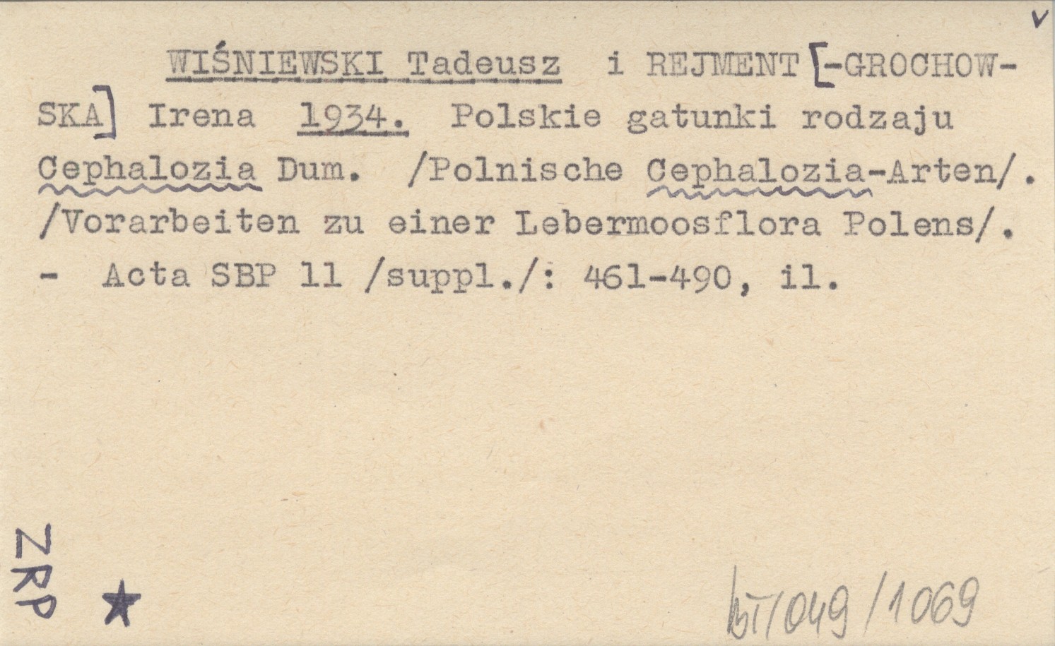 WIŚNIEWSKI Tadeusz REJMENT [-GROCHOWSKA], Irena. ; 1934 Polskie gatunki rodzaju Cephalozia Dum. (Polnische Cephalozia-Arten). (Vorarbeiten zu einer Lebermoosflora Polens).
