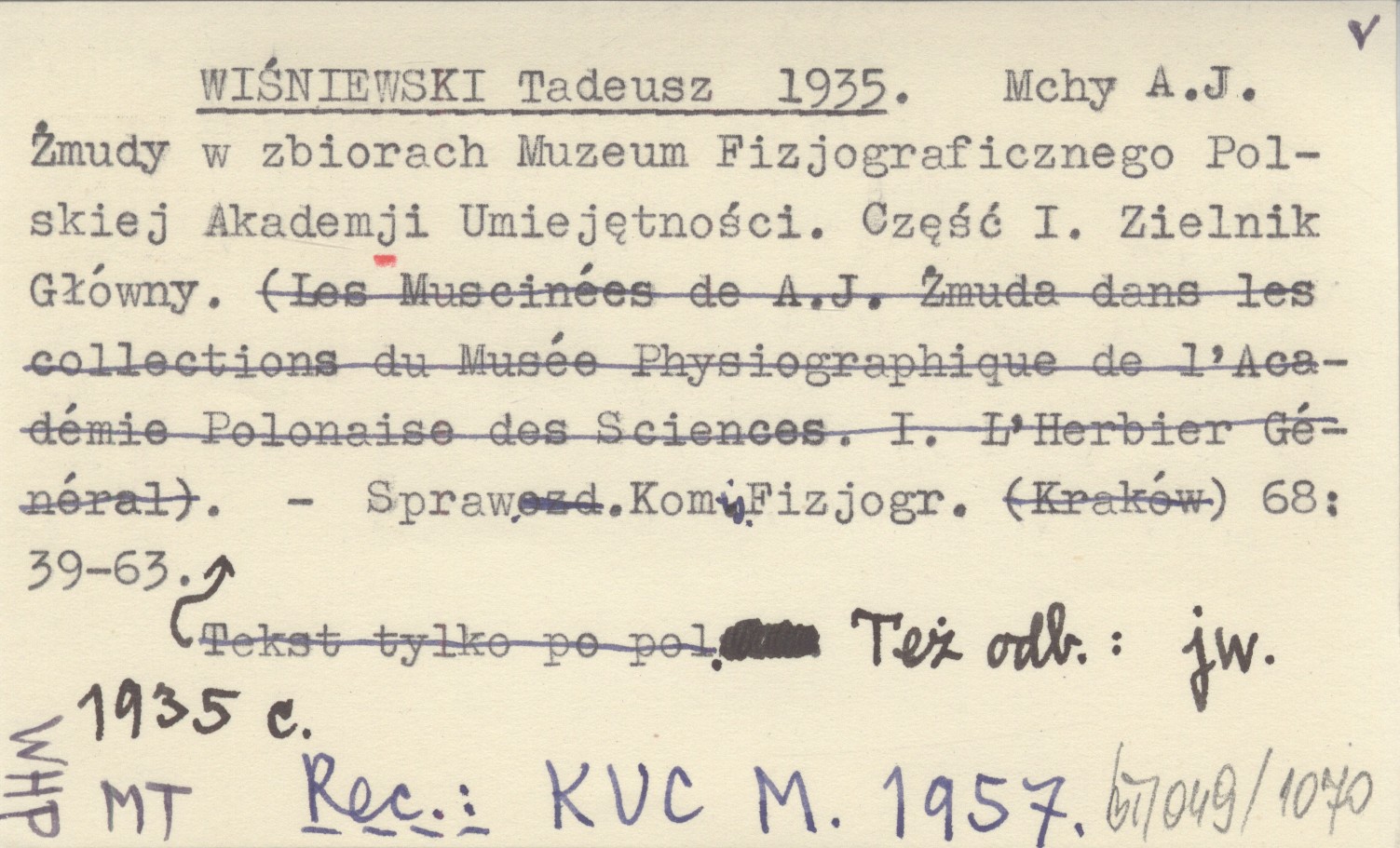 WIŚNIEWSKI Tadeusz 1935 Mchy A.J. Żmudy w zbiorach Muzeum Fizjograficznego Polskiej Akademji Umiejętności. Część I. Zielnik Główny.