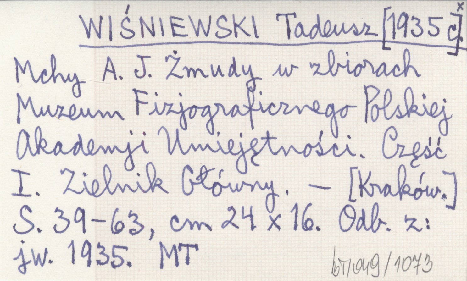 WIŚNIEWSKI Tadeusz [1935 c] Mchy A. J. Żmudy w zbiorach Muzeum Fizjograficznego Polskiej Akademji Umiejętności. Część I. Zielnik Główny.