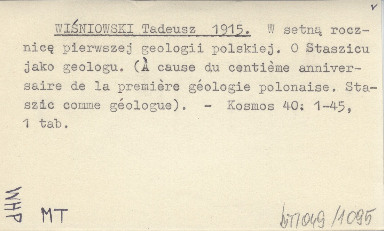 WIŚNIOWSKI Tadeusz 1915 W setną rocznicę pierwszej geologii polskiej. O Staszicu jako geologu. (Á cause du centiéme anniversaire de la premiére géologie polonaise. Staszic comme géologue).