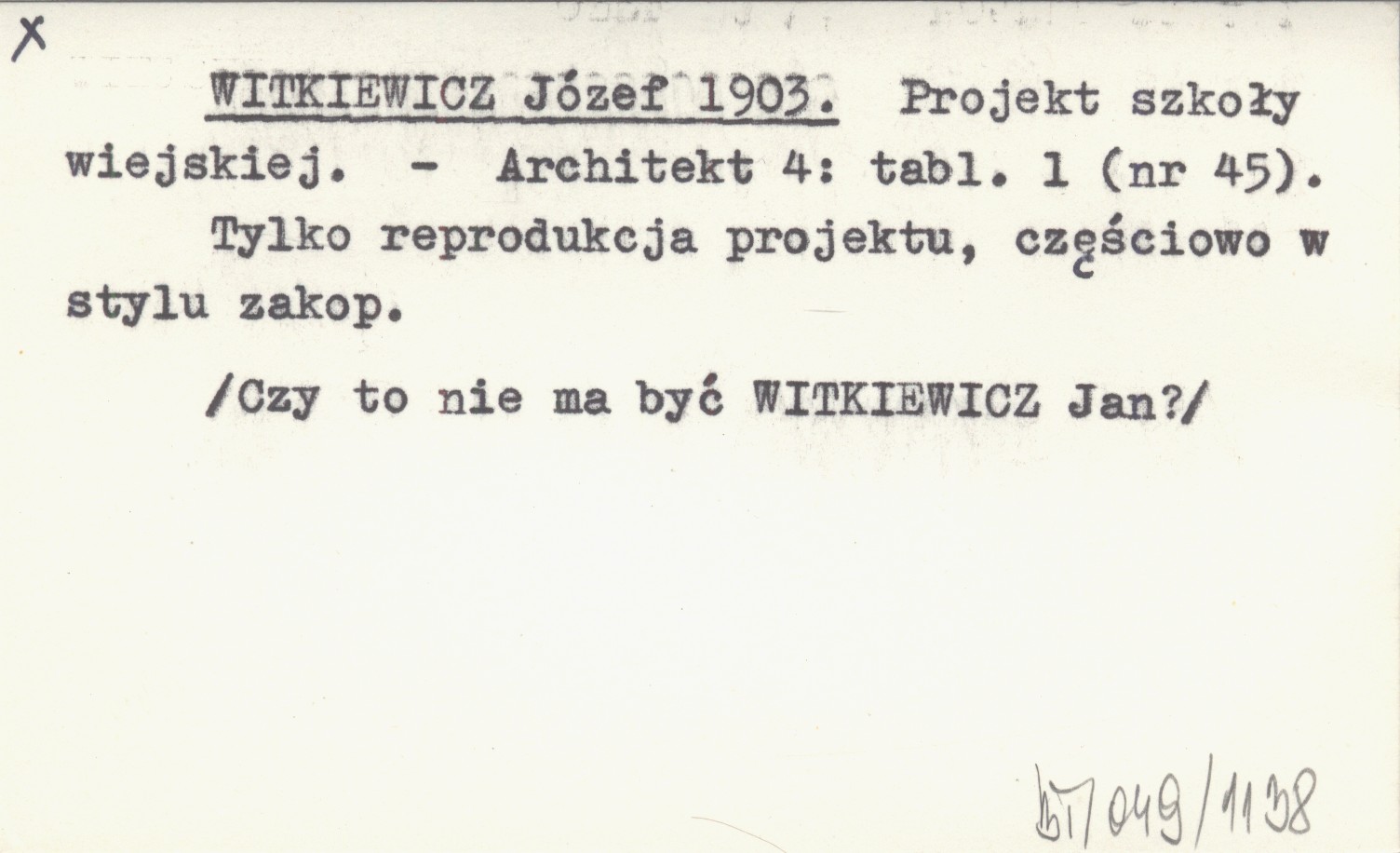 Architekt, 4: 1 k. tabl. (nr 45). Tylko reprodukcja projektu, częściowo w stylu zakop. (Czy to nie ma być WITKIEWICZ Jan?)