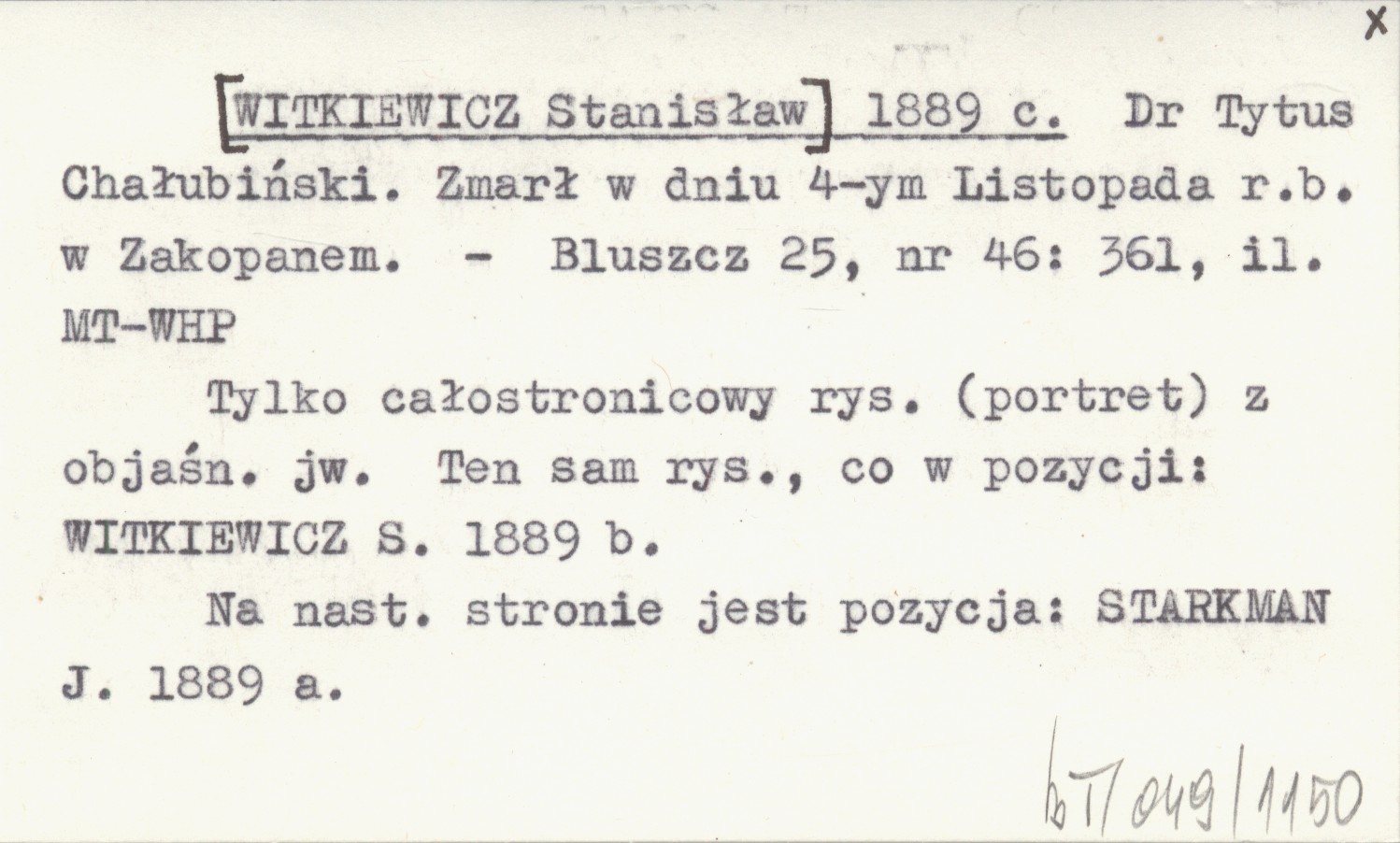 [WITKIEWICZ Stanisław] 1889 c Dr Tytus Chałubiński. Zmarł w dniu 4-ym Listopada r.b. w Zakopanem.