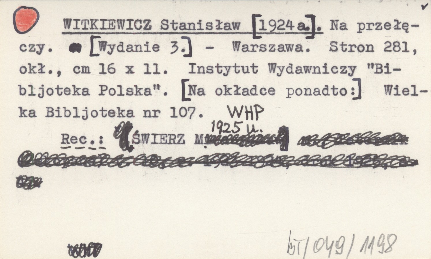 WYD: 3 Warszawa , 281 s., okł., 16x11 cm. Instytut Wydawniczy "Bibljoteka Polska". [Na okładce ponadto:] Wielka Bibljoteka nr 107. REC: ŚWIERZ M. 1925 u