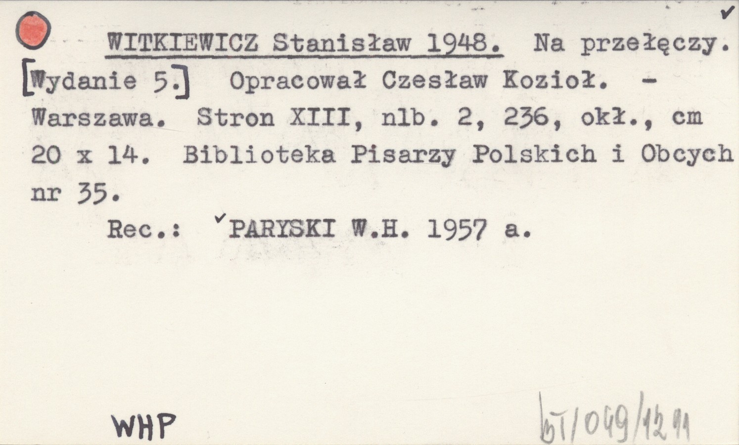 WITKIEWICZ Stanisław 1948 Na przełęczy. [Wydanie 5.] Opracował Czesław Kozioł.