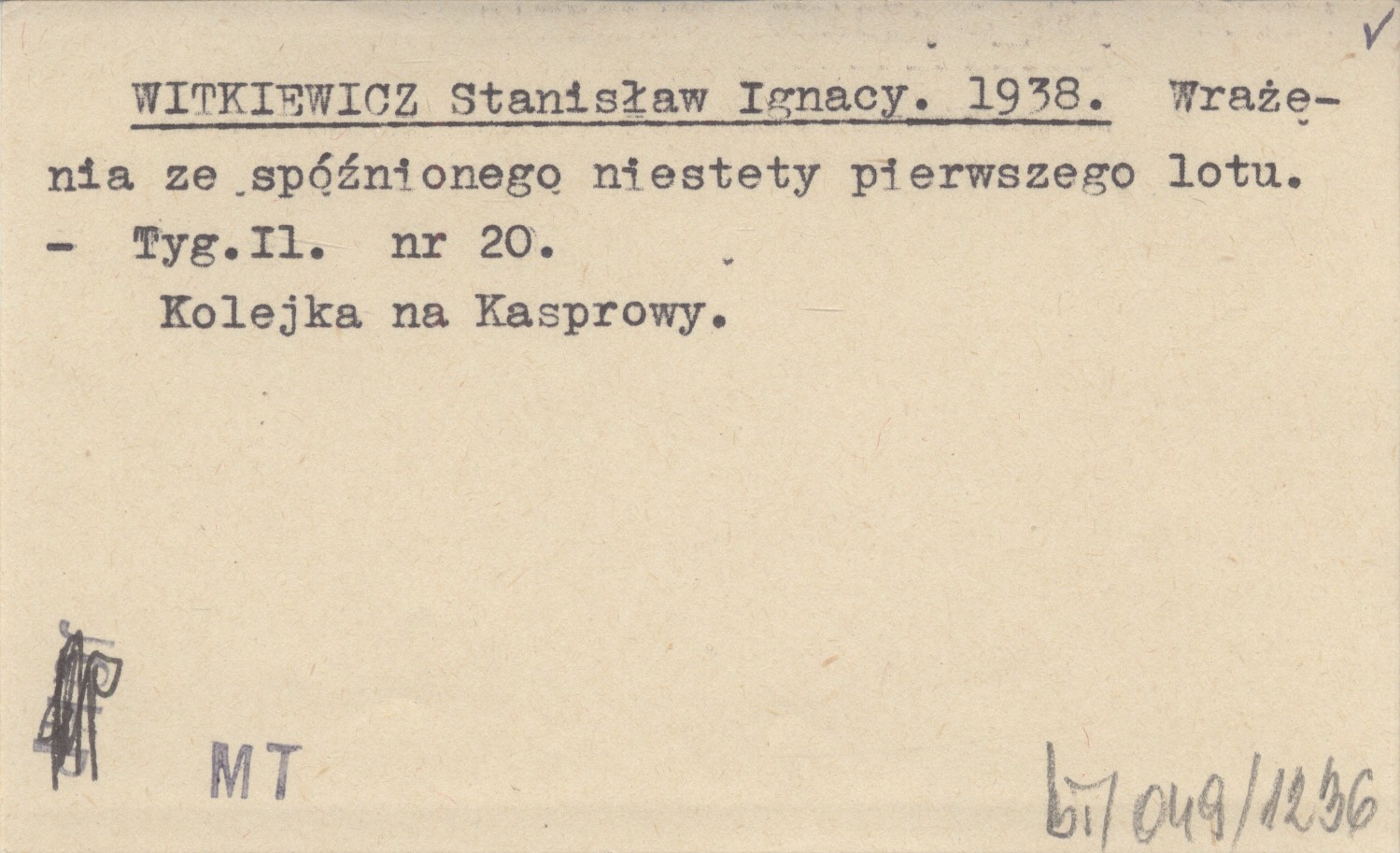 WITKIEWICZ Stanisław Ignacy 1938 Wrażenia ze spóźnionego niestety pierwszego lotu.