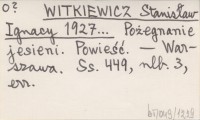 WITKIEWICZ Stanisław Ignacy 1927 Pożegnanie jesieni. Powieść.