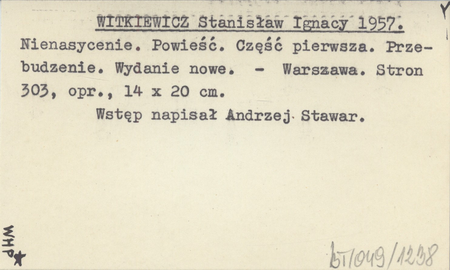 WITKIEWICZ Stanisław Ignacy 1957 Nienasycenie. Powieść. Część pierwsza. Przebudzenie. Wydanie nowe.