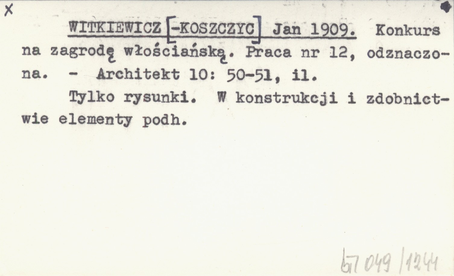 WITKIEWICZ [-KOSZCZYC] Jan 1909 Konkurs na zagrodę włościańską. Praca nr 12, odznaczona.