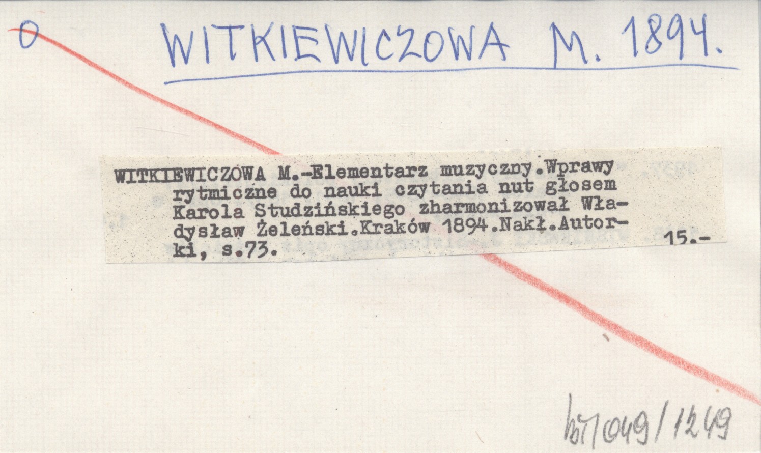 WITKIEWICZOWA M. 1894 Elementarz muzyczny. Wprawy rytmiczne do nauki czytania nut głosem Karola Studzińskiego zharmonizował Władysław Żeleński.