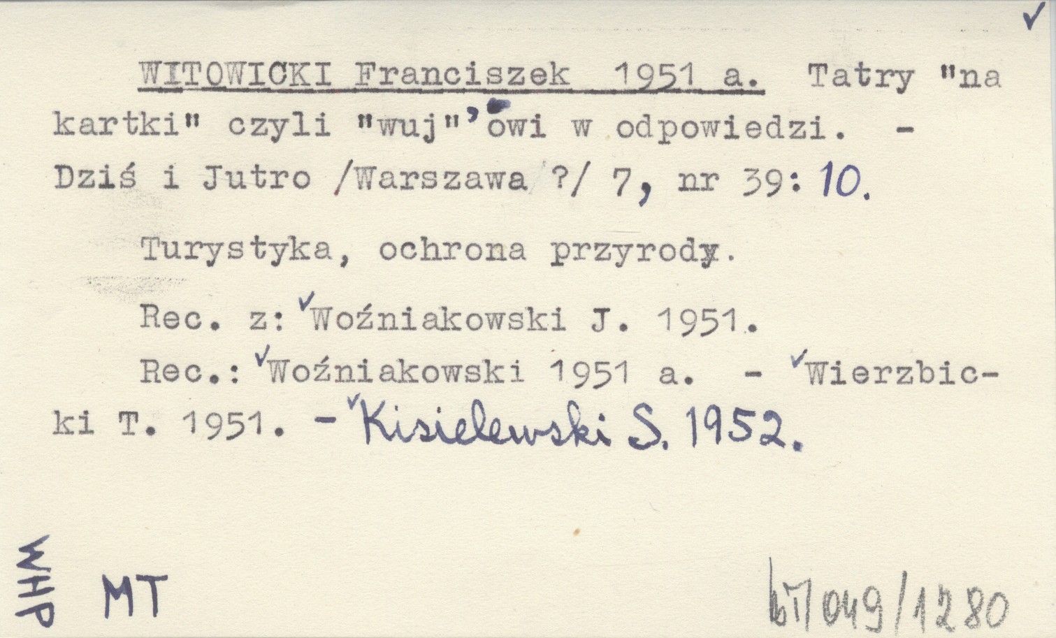 Dziś i Jutro (Warszawa ?) , 7, nr 39: 10. Turystyka, ochrona przyrody. Rec. z: WOŹNIAKOWSKI J. 1951. REC: WOŹNIAKOWSKI 1951 a ; WIERZBICKI T. 1951 ; KISIELEWSKI S. 1952 ;