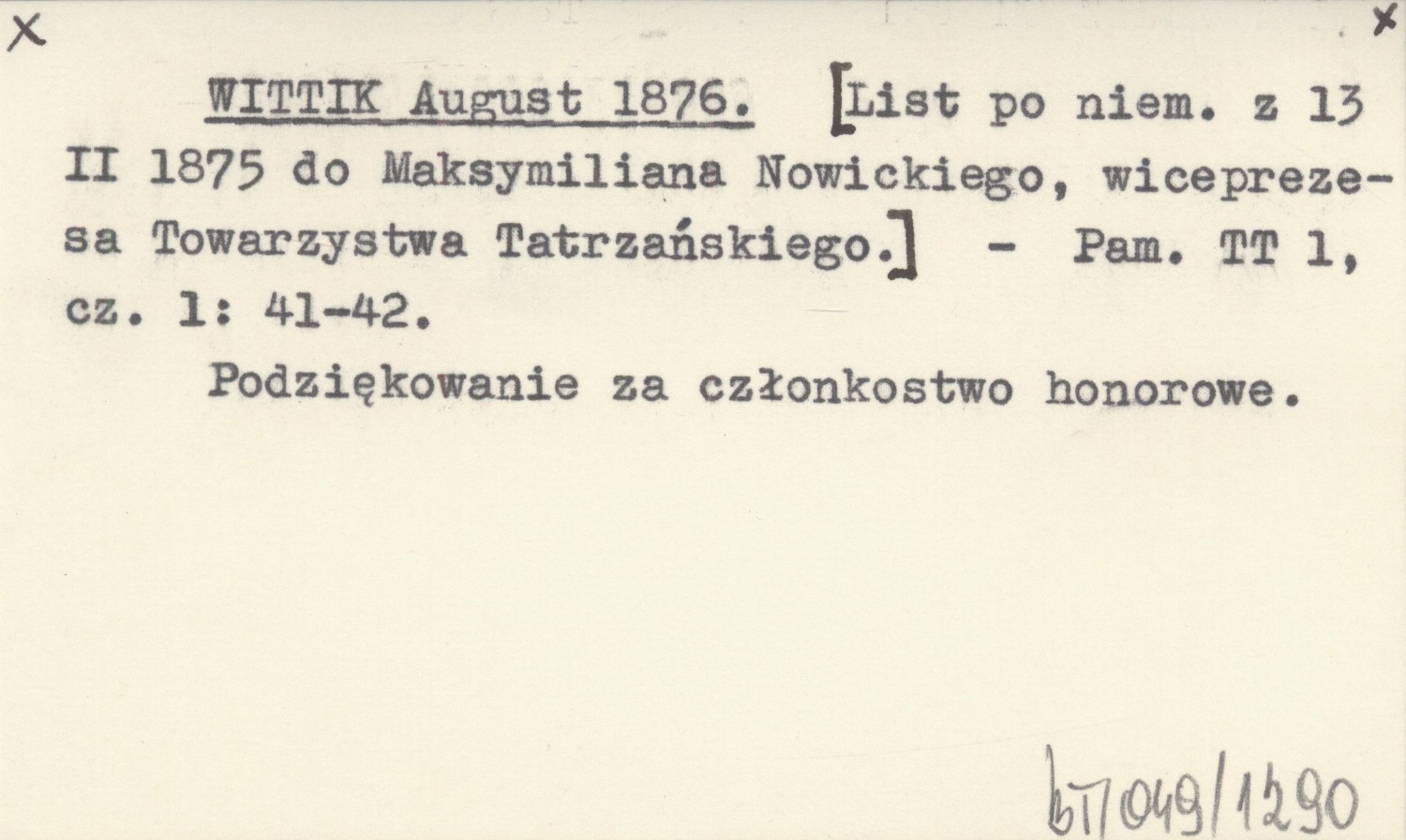 WITTIK August 1876 [List po niem. z 13 II 1875 do Maksymiliana Nowickiego, wiceprezesa Towarzystwa Tatrzańskiego].