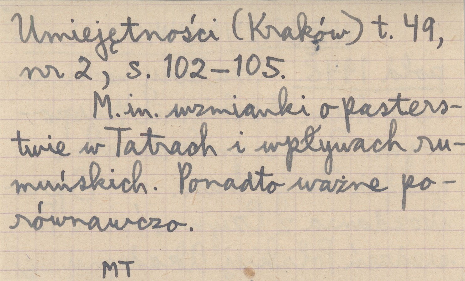 Sprawozdania z Czynności i Posiedzeń Polskiej Akademii Umiejętności (Kraków) , T. 49, nr 2: 102-105. M.in. wzmianki o pasterstwie w Tatrach i wpływach rumuńskich. Ponadto ważne porównawczo. REC: SULIMIRSKI T. 1974: 94.