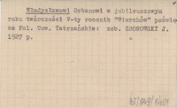 Władysławowi Orkanowi w jubileuszowym roku twórczości V-ty rocznik "Wierchów" poświęca Pol. Tow. Tatrzańskie.