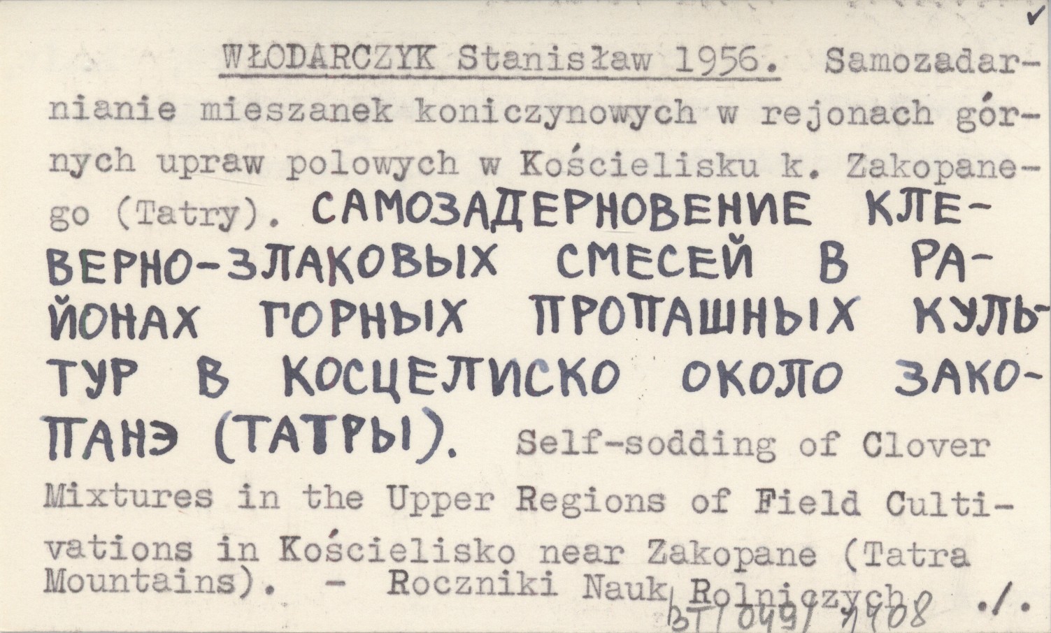 WŁODARCZYK Stanisław 1956 Samozadarnianie mieszanek koniczynowych w rejonach górnych upraw polowych w Kościelisku k. Zakopanego (Tatry). Samozadernovenie kleverno-zlakovych smecej v rajonach gornych propašnych kul'tur v Koscelisko okolo Zakopane (Tatry). Self-sodding of Clover Mixtures in the Upper Regions of Field Cultivations in Kościelisko near Zakopane (Tatra Mountains).