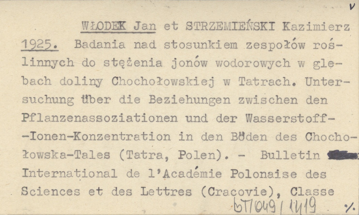 WŁODEK Jan STRZEMIEŃSKI, Kazimierz. ; 1925 Badania nad stosunkiem zespołów roślinnych do stężenia jonów wodorowych w glebach doliny Chochołowskiej w Tatrach. Untersuchung über die Beziehungen zwischen den Pflanzenassoziationen und der Wasserstoff-Ionen-Konzentration in den Böden des Chochołowska-Tales (Tatra, Polen).