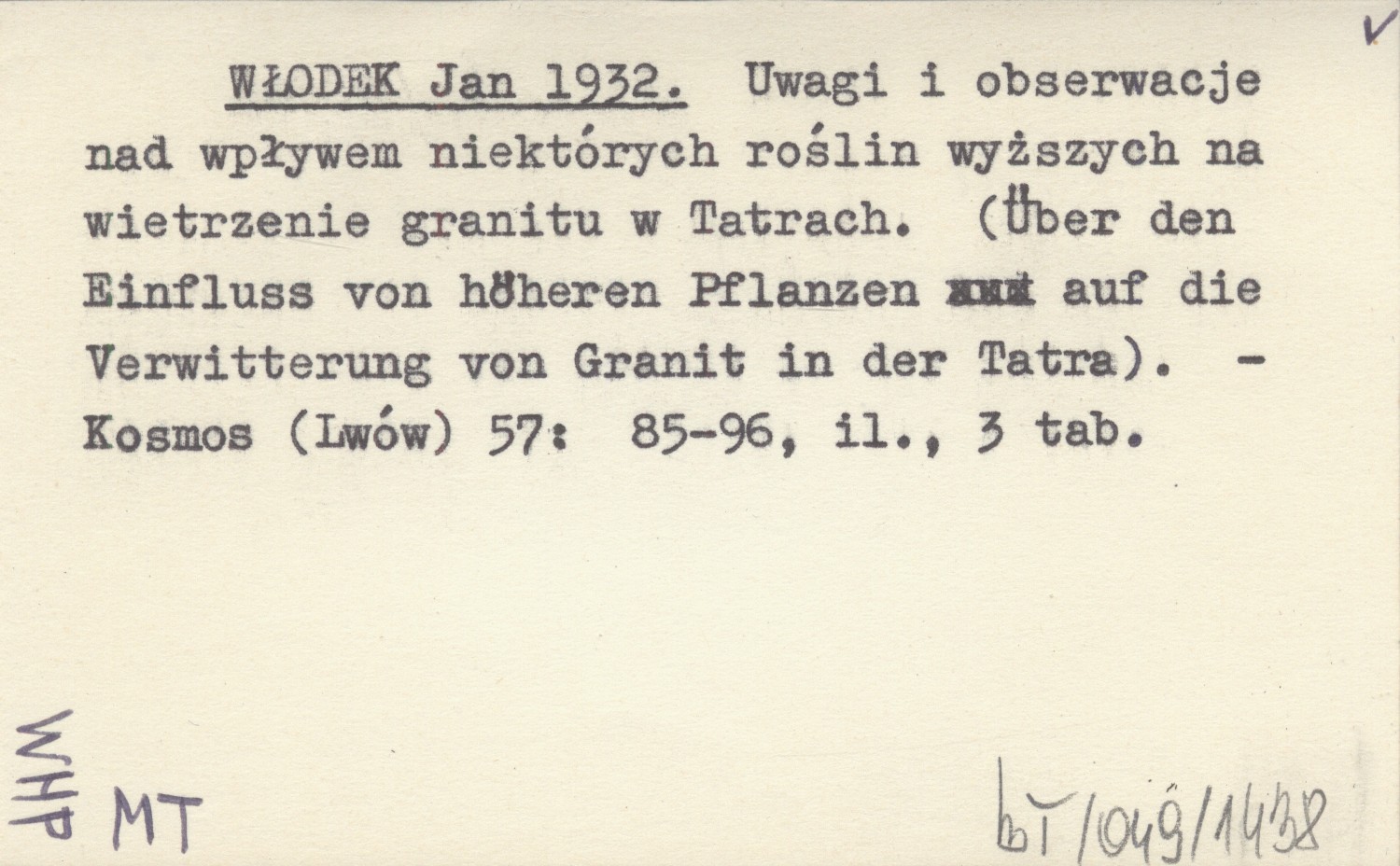 WŁODEK Jan 1932 Uwagi i obserwacje nad wpływem niektórych roślin wyższych na wietrzenie granitu w Tatrach. (Über den Einfluss von höheren Pflanzen auf die Verwitterung von Granit in der Tatra).