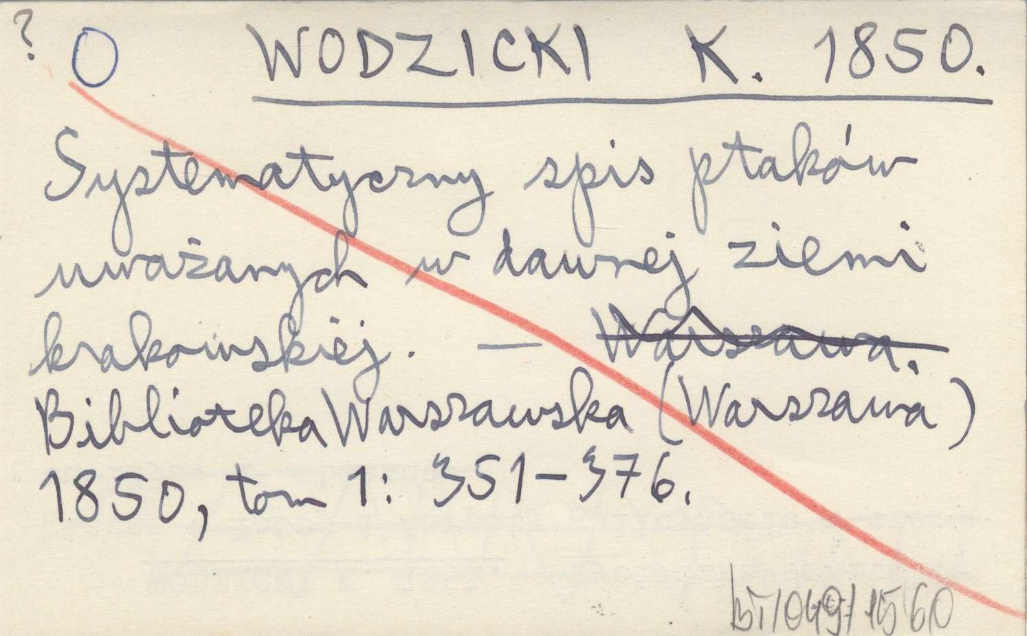 WODZICKI K. 1850 Systematyczny spis ptaków uważanych w w dawnej ziemi krakowskiej.