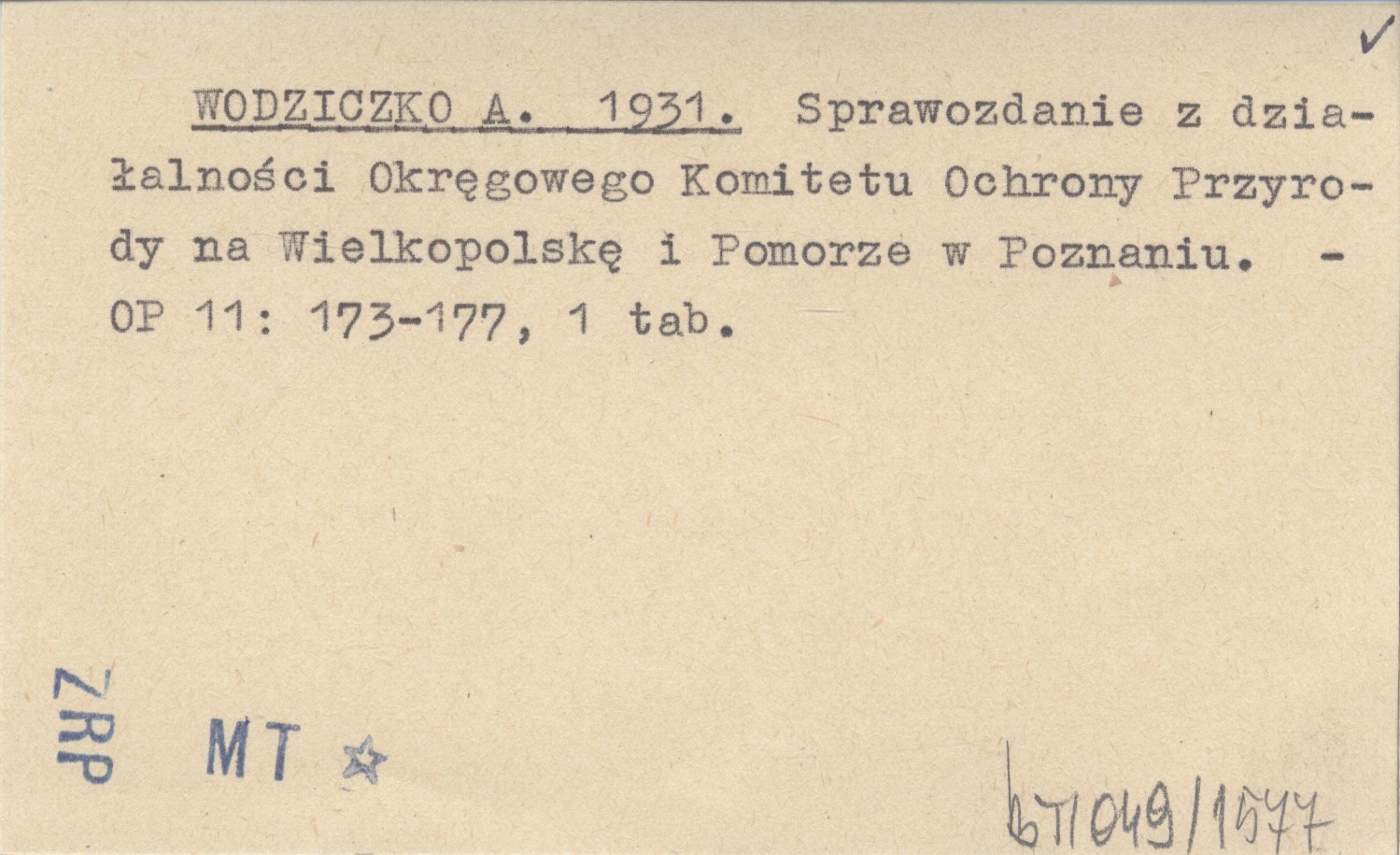 WODZICZKO A. 1931 Sprawozdanie z działalności Okręgowego Komitetu Ochrony Przyrody na Wielkopolskę i Pomorze w Poznaniu.