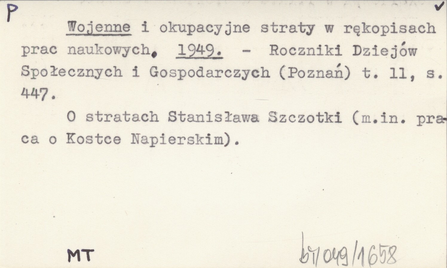 Roczniki Dziejów Społecznych i Gospodarczych (Poznań) , T. 11: 447. O stratach Stanisława Szczotki (m.in. praca o Kostce Napierskim).