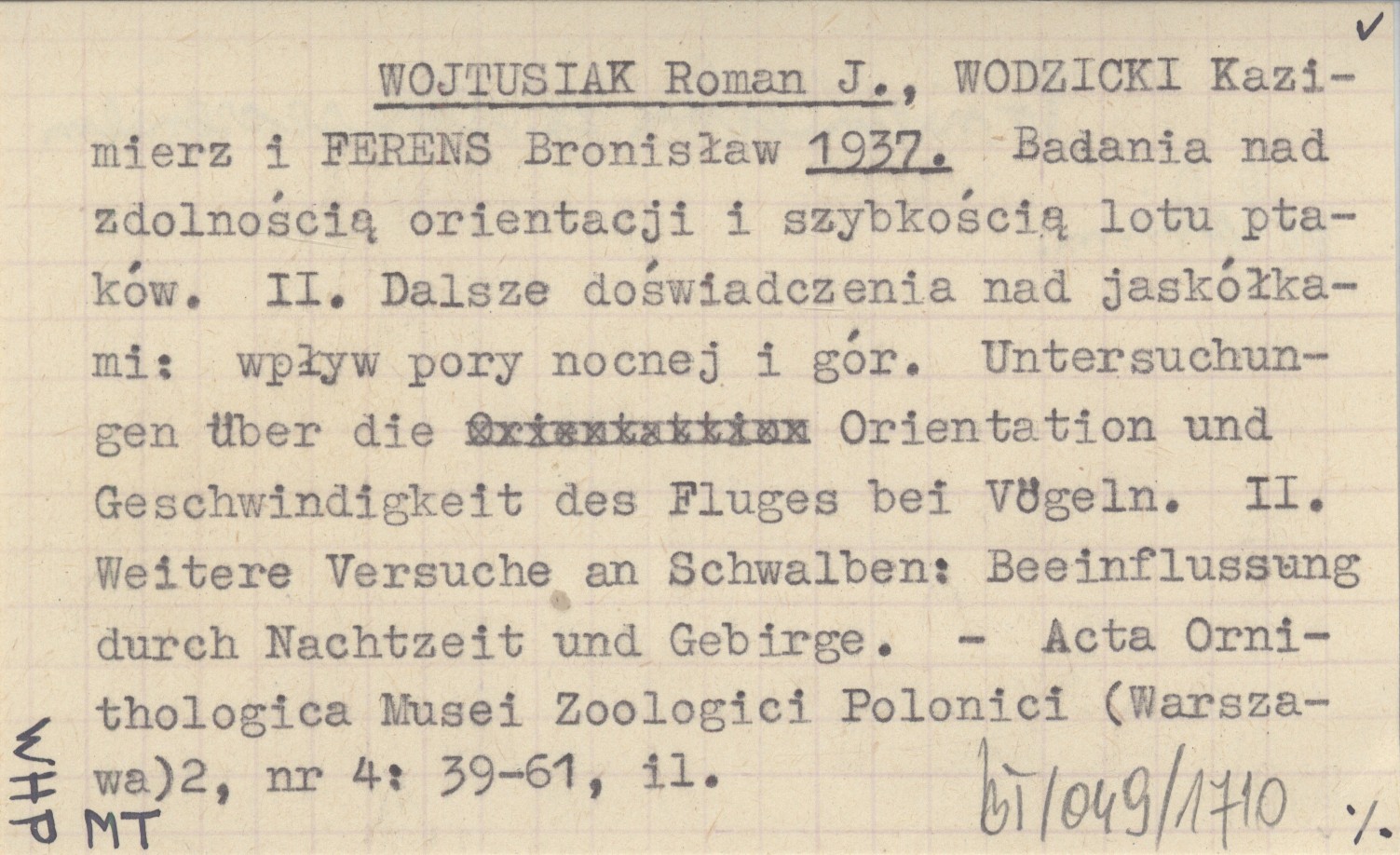 WOJTUSIAK Roman J. WODZICKI, Kazimierz. ; FERENS, Bronisław. ; 1937 Badania nad zdolnością orientacji i szybkością lotu ptaków. II. Dalsze doświadczenia nad jaskółkami: wpływ pory nocnej i gór. Untersuchungen über die Orientation und Geschwindigkeit des Fluges bei Vögeln. II. Weitere Versuche an Schwalben: Beeinflussung durch Nachtzeit und Gebirge.