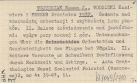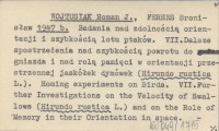 WOJTUSIAK Roman J. FERENS, Bronisław. ; 1947 b Badania nad zdolnością orientacji i szybkością lotu ptaków. VII.Dalsze spostrzeżenia nad szybkością powrotu do gniazda i nad rolą pamięci w orientacji przestrzennej jaskółek dymówek (Hirundo rustica L.). Homing experiments on Birds. VII.Further Investigations on the Velocity of Swallows (Hirundo rustica L.) and on the Role of Memory in their Orientation in space.