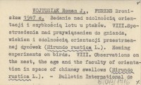 WOJTUSIAK Roman J. FERENS, Bronisław. ; 1947 c Badania nad zdolnością orientacji i szybkością lotu ptaków. VIII.Spostrzeżenia nad przywiązaniem do gniazda, wiekiem i zdolnością orientacji przestrzennej dymówek (Hirundo rustica L.). Homing experiments on Birds. VIII. Observations on the nest, the age and the faculty of orientation in space of chimney swallows (Hirundo rustica L.).