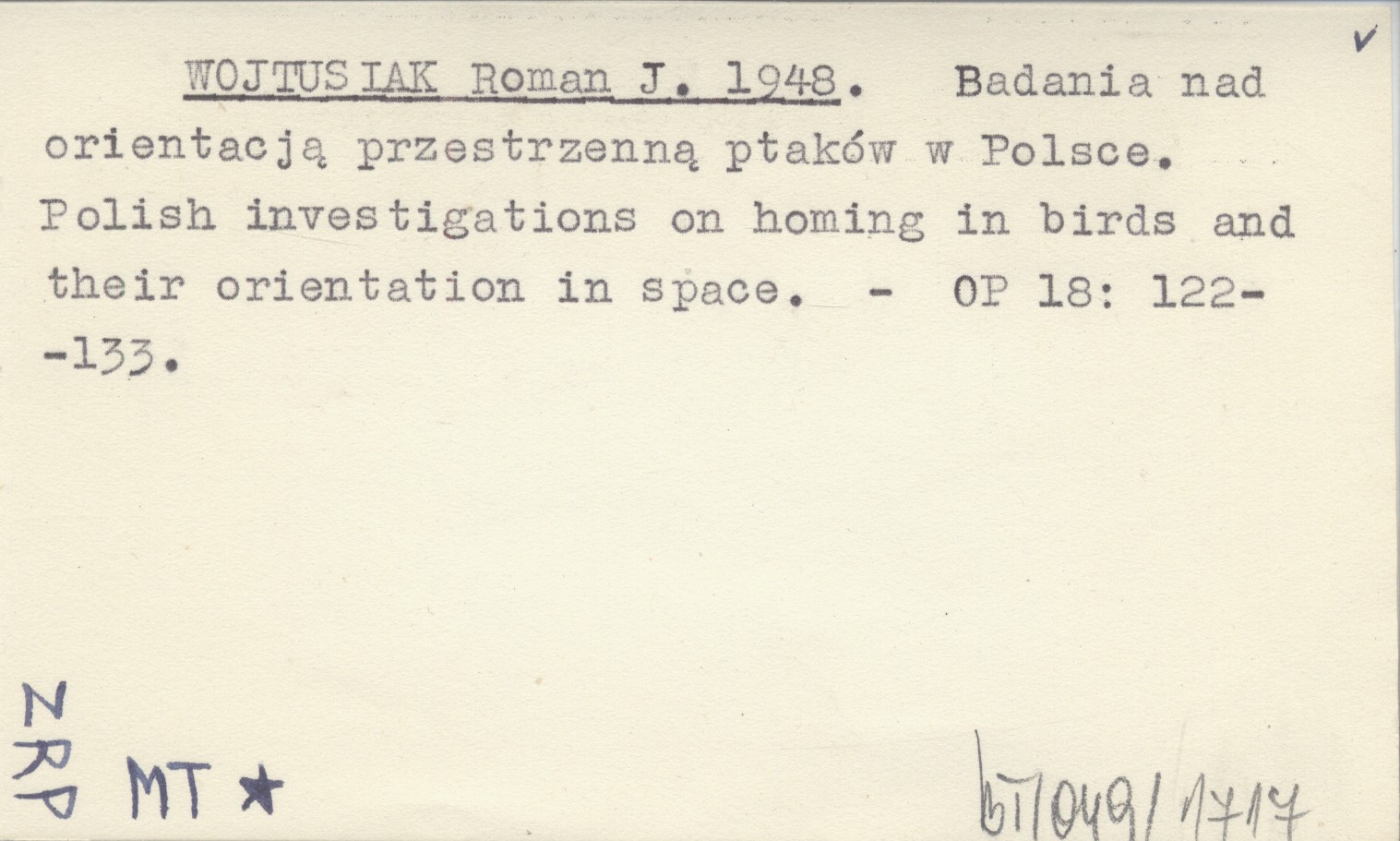 WOJTUSIAK Roman J. 1948 Badania nad orientacją przestrzenną ptaków w Polsce. Polish investigations on homing in birds and their orientation in space.