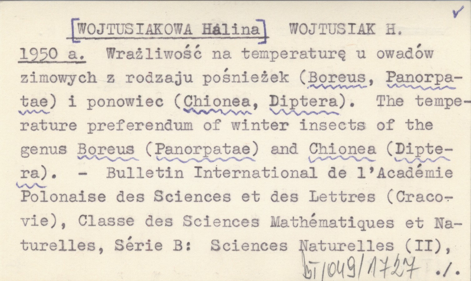 WOJTUSIAK H. [WOJTUSIAKOWA Halina] 1950 a Wrażliwość na temperaturę u owadów zimowych z rodzaju pośnieżek (Boreus, Panorpatae) i ponowiec (Chionea, Diptera). The temperature preferendum of winter insects of the genus Boreus (Panorpatae) and Chionea (Diptera).