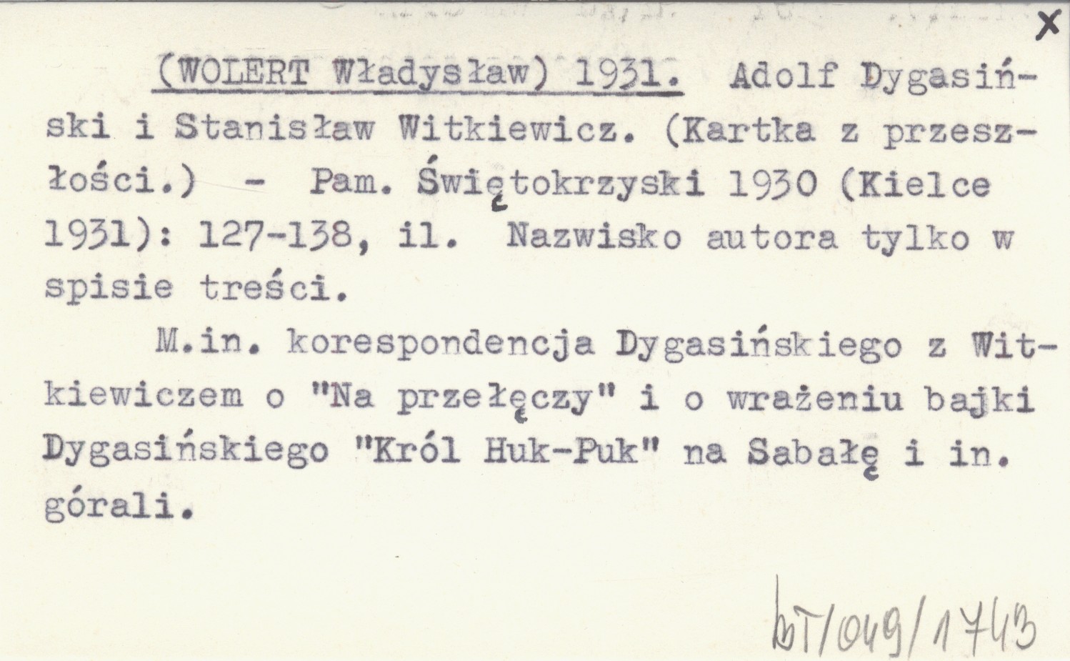Pamiętnik Świętokrzyski 1930 (Kielce) , 1931: 127-138, il. M.in. korespondencja Dygasińskiego z Witkiewiczem o "Na przełęczy" i o wrażeniu bajki Dygasińskiego "Król Huk-Puk" na Sabałę i in. górali. Nazwisko autora tylko w spisie treści.