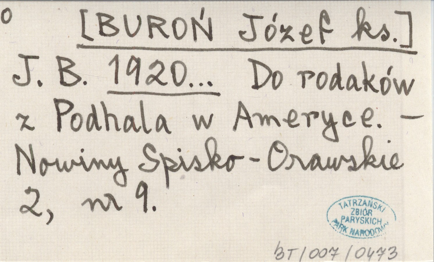 J. B. [BUROŃ Józef ks.] 1920... Do rodaków z Podhala w Ameryce.