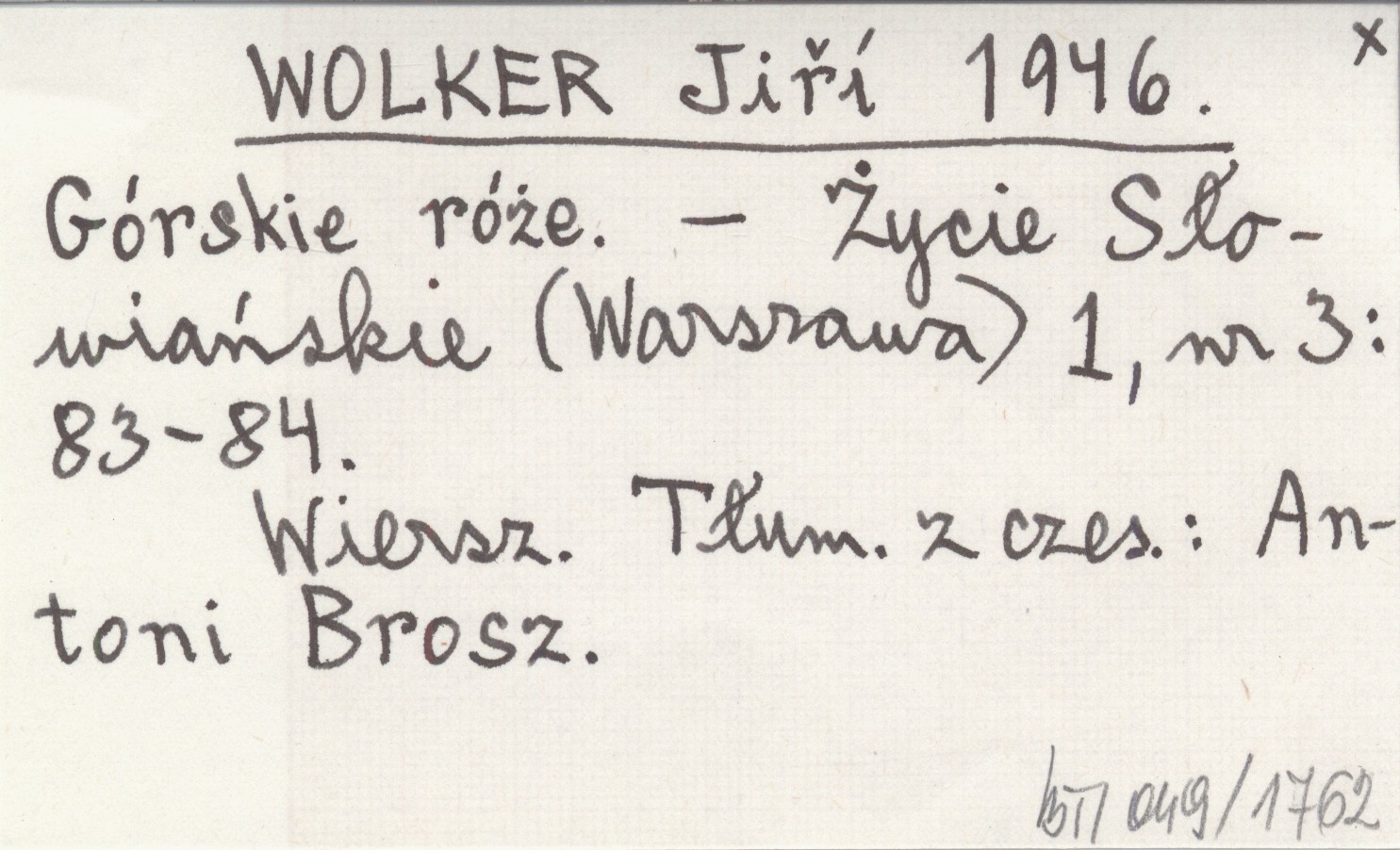 Życie Słowiańskie (Warszawa) , 1, nr 3: 83-84. Wiersz. Tłum. z czes.: Antoni Brosz.