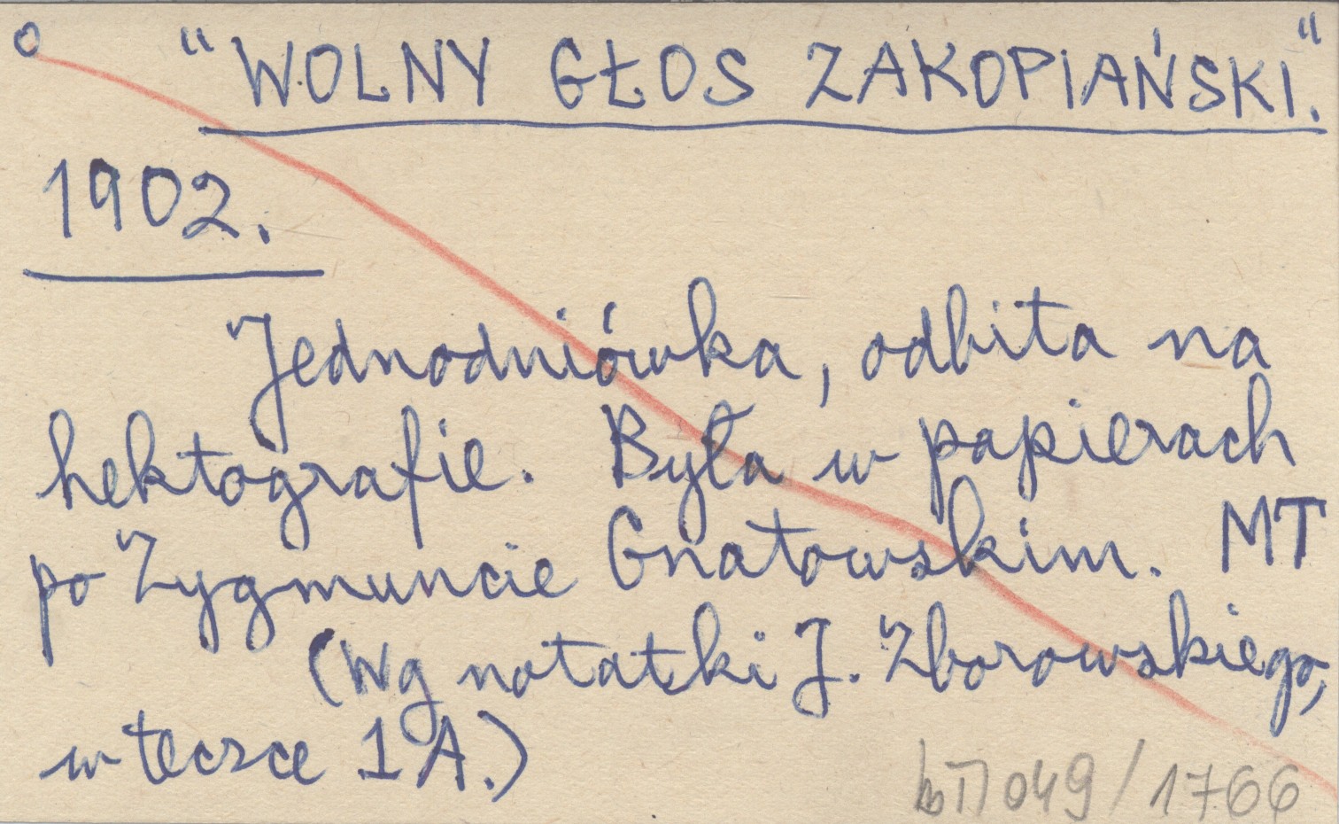 WOLNY GŁOS ZAKOPIAŃSKI, 1902. Jednodniówka, odbita na hektografie. Była w papierach po Zygmuncie Gnatowskim. (Wg notatki J. Zborowskiego, w teczce 1A.)