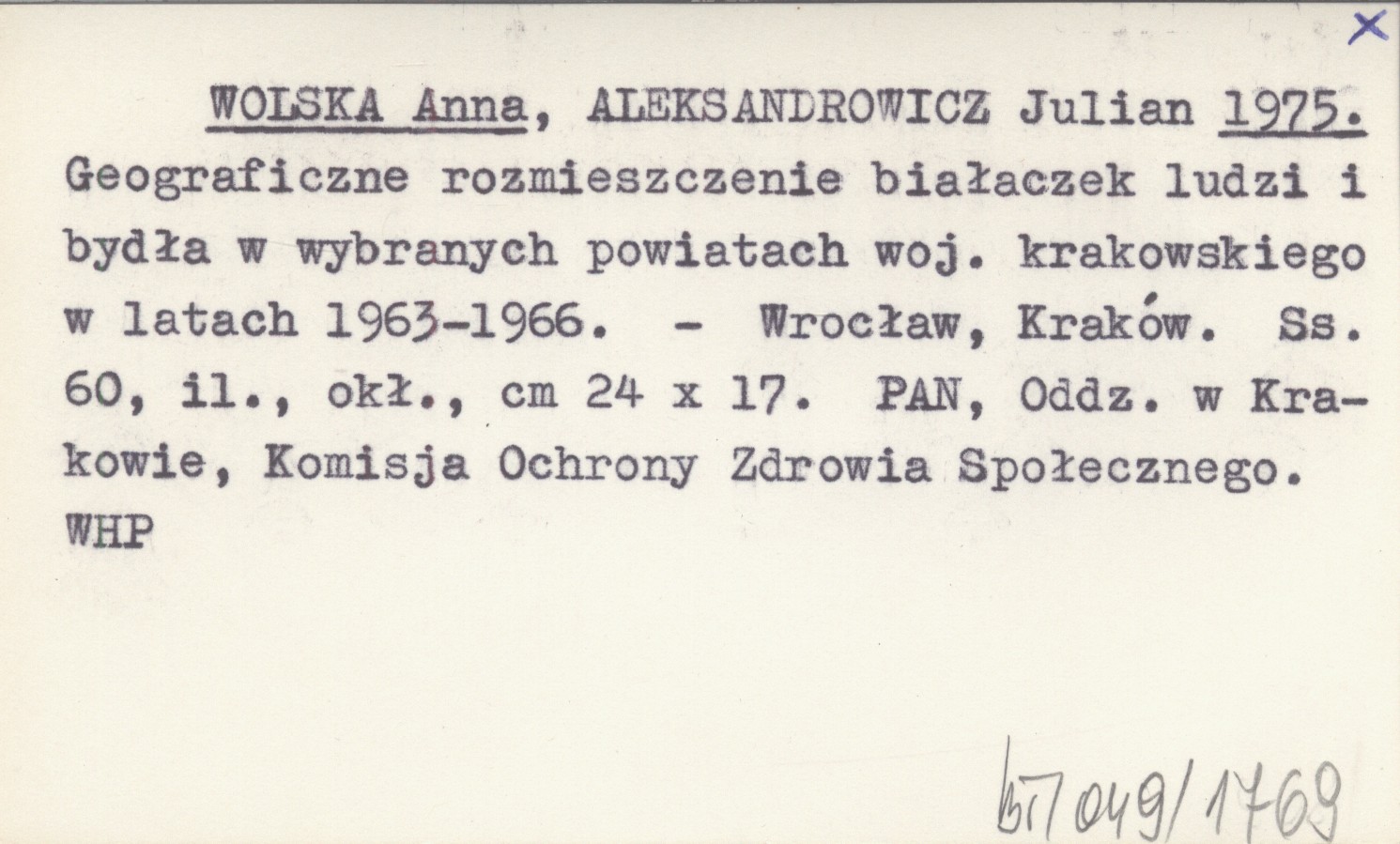 WOLSKA Anna ALEKSANDROWICZ, Julian. ; 1975 Geograficzne rozmieszczenie białaczek ludzi i bydła w wybranych powiatach woj. krakowskiego w latach 1963-1966.