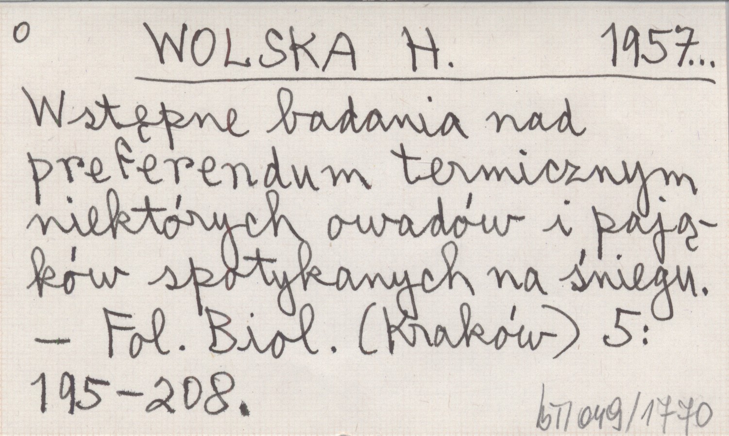 WOLSKA H. 1957... Wstępne badania nad preferendum termicznym niektórych owadów i pająków spotykanych na śniegu.