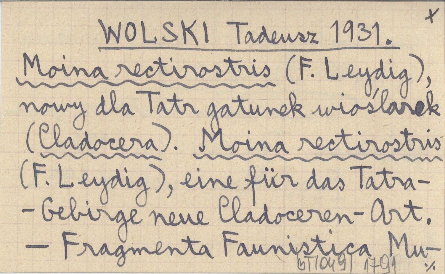 WOLSKI Tadeusz 1931 Moina rectirostris (F. Leydig), nowy dla Tatr gatunek wioślarek (Cladocera). Moina rectirostris (F. Leydig), eine für das Tatra-Gebirge neue Cladoceren-Art.