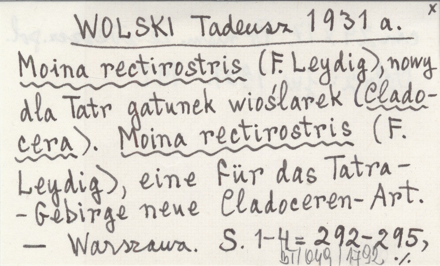 WOLSKI Tadeusz 1931 a Moina rectirostris (F. Leydig), nowy dla Tatr gatunek wioślarek (Cladocera). Moina rectirostris (F. Leydig), eine für das Tatra-Gebirge neue Cladoceren-Art.