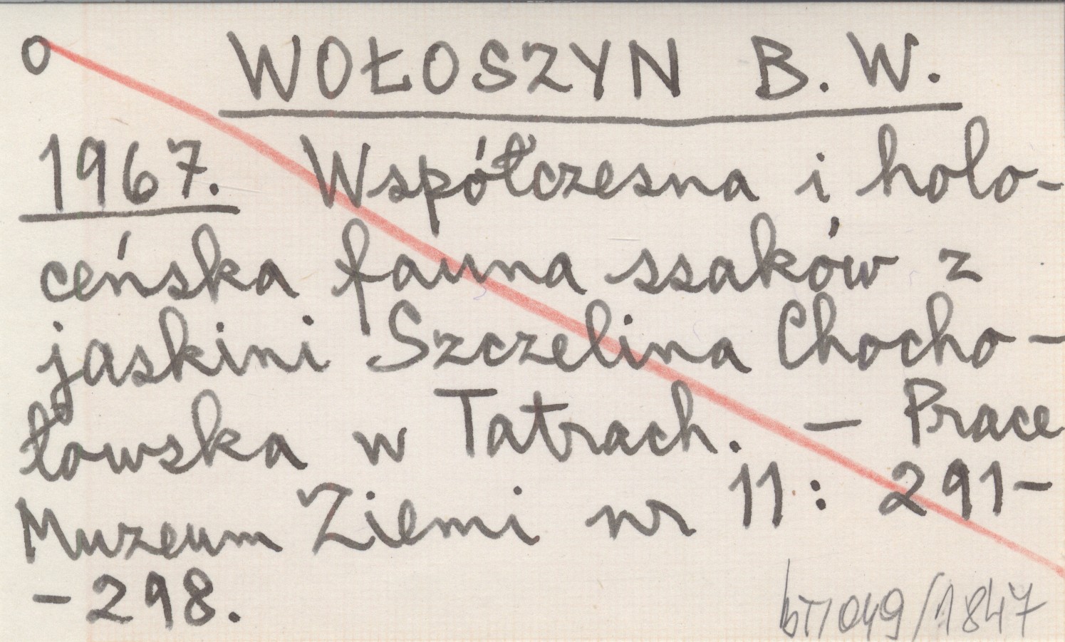 WOŁOSZYN B. W. 1967 Współczesna i holoceńska fauna ssaków z jaskini Szczelina Chochołowska w Tatrach.
