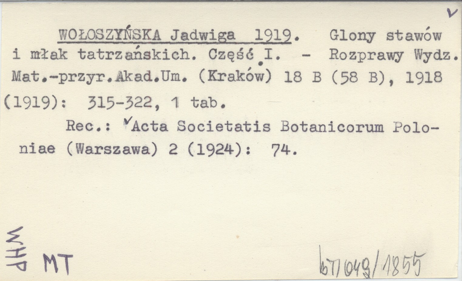 WOŁOSZYŃSKA Jadwiga 1919 Glony stawów i młak tatrzańskich. Część I.