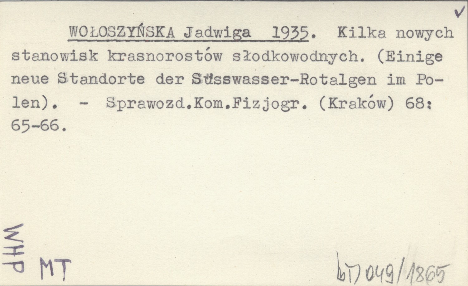 WOŁOSZYŃSKA Jadwiga 1935 Kilka nowych stanowisk krasnorostów słodkowodnych. (Einige neue Standorte der Süsswasser-Rotalgen im Polen).