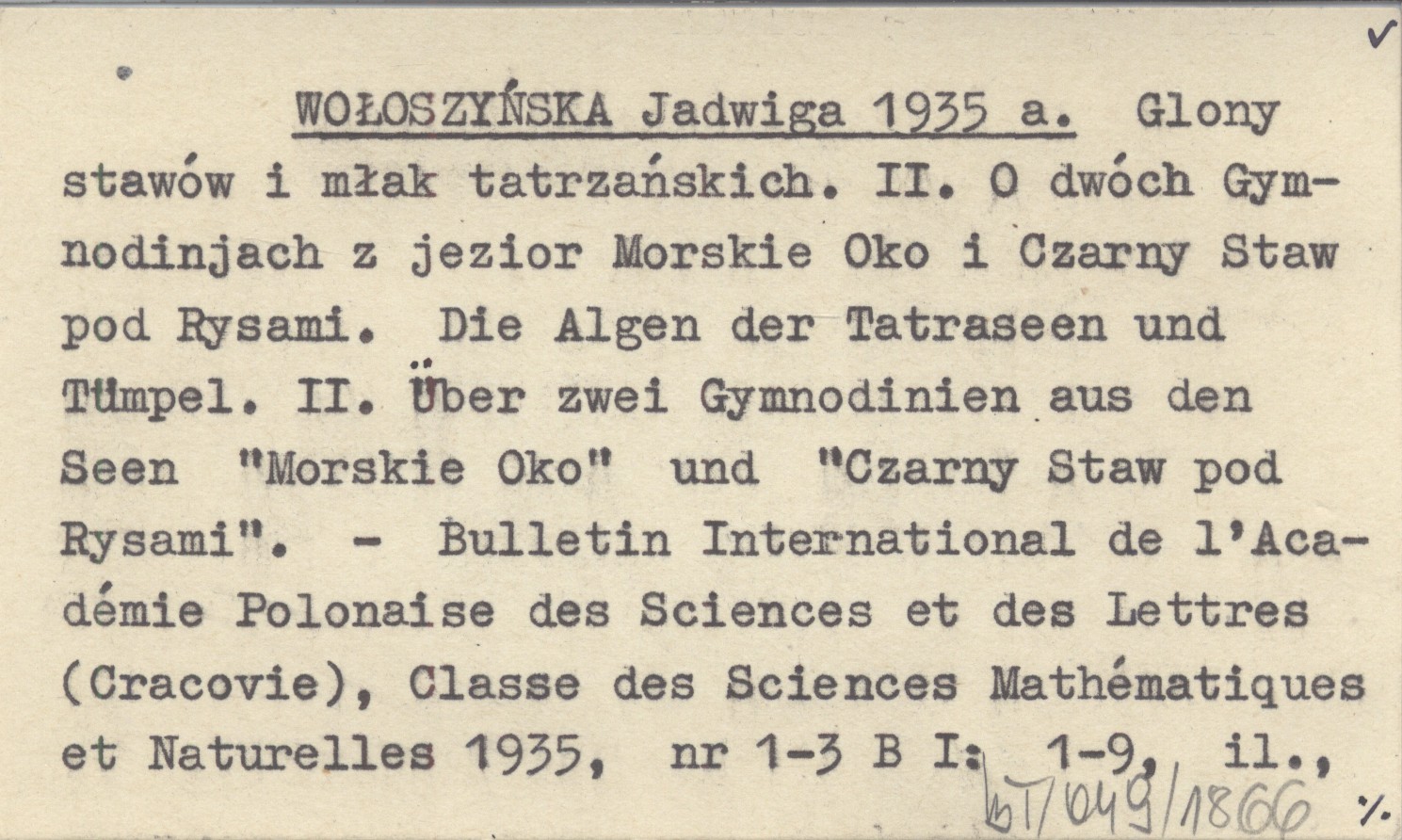 WOŁOSZYŃSKA Jadwiga 1935 a Glony stawów i młak tatrzańskich. II. O dwóch Gymnodinjach z jezior Morskie Oko i Czarny Staw pod Rysami. Die Algen der Tatraseen und Tümpel. II. Über zwei Gymnodinien aus den Seen "Morskie Oko" und "Czarny Staw pod Rysami".