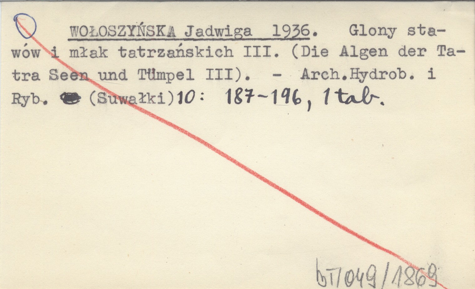 WOŁOSZYŃSKA Jadwiga 1936 Glony stawów i młak tatrzańskich III. (Die Algen der Tatra Seen und Tümpel III).