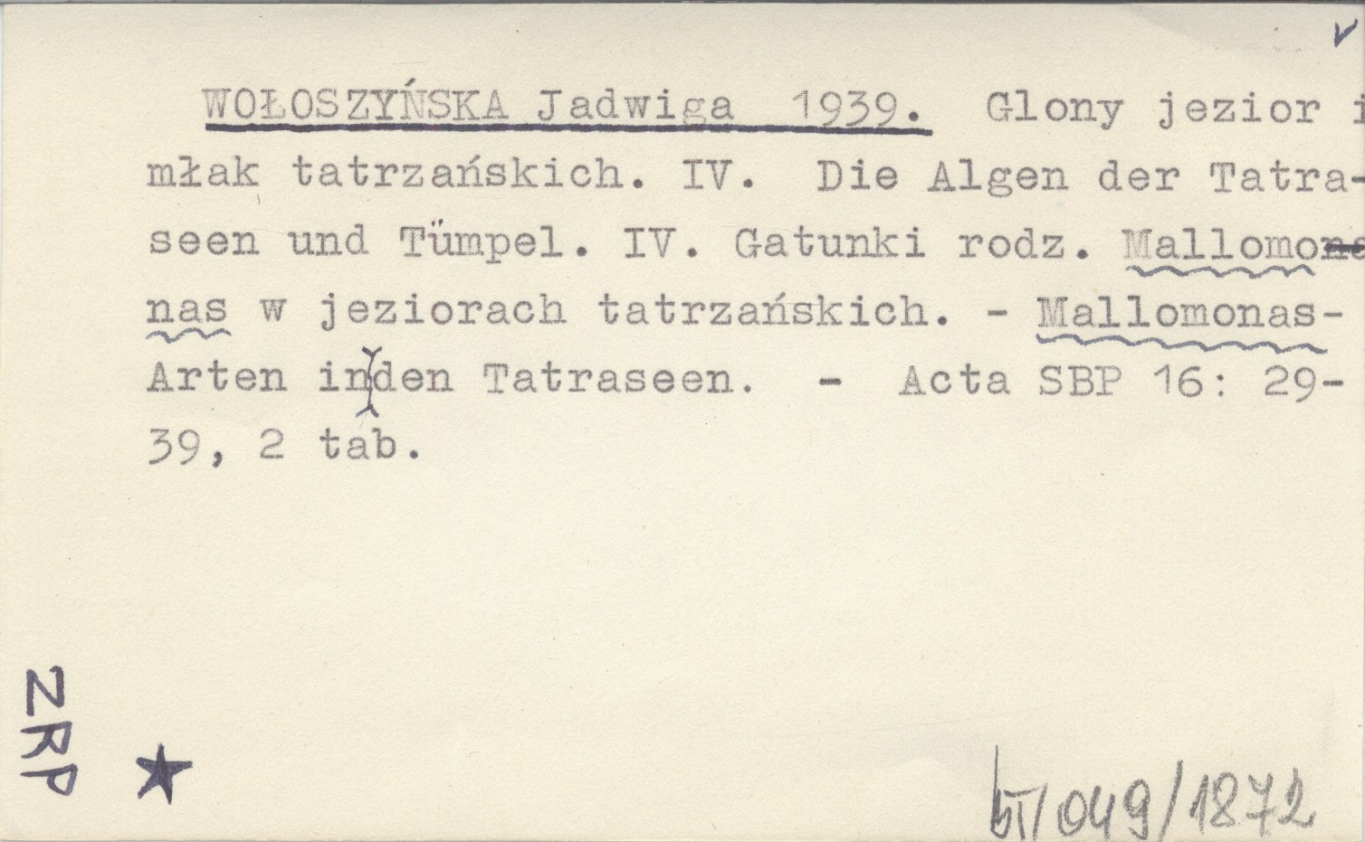 WOŁOSZYŃSKA Jadwiga 1939 Glony jezior i młak tatrzańskich. IV. Die Algen der Tatraseen und Tümpel. IV. Gatunki rodz. Mallomonas w jeziorach tatrzańskich. - Mallomonas-Arten in den Tatraseen.