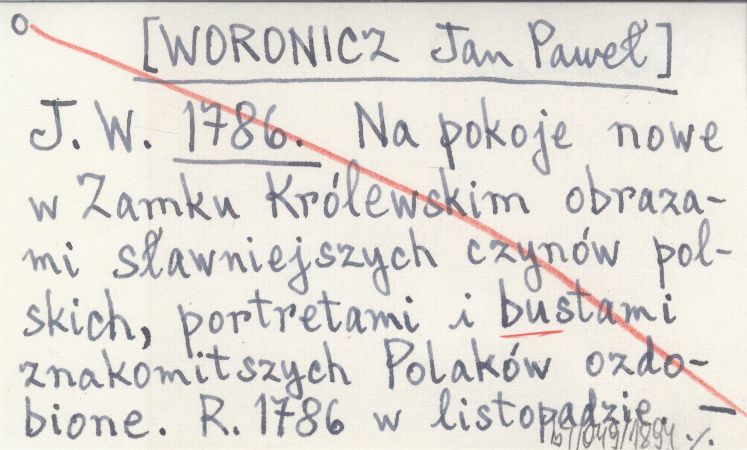 J. W. [WORONICZ Jan Paweł] 1786 Na pokoje nowe w Zamku Królewskim obrazami sławniejszych czynów polskich, portretami i bustami znakomitszych Polaków ozdobione. R. 1786 w listopadzie.