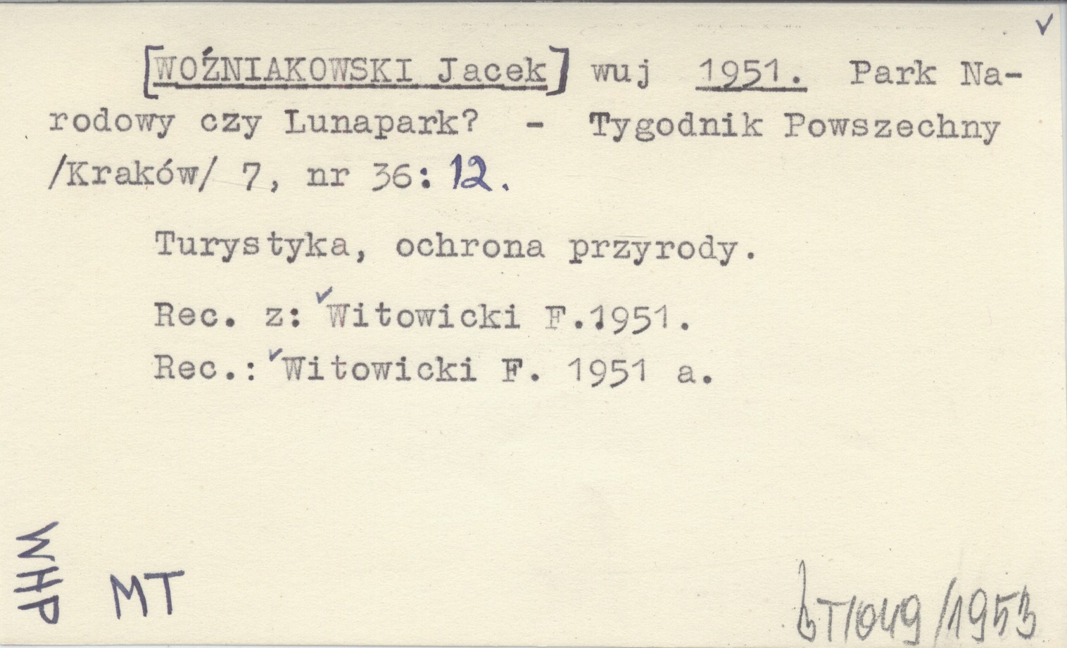 Tygodnik Powszechny (Kraków) , 7, nr 36: 12. Turystyka, ochrona przyrody. Rec. z: Witowicki F. 1951. REC: WITOWICKI F. 1951 a
