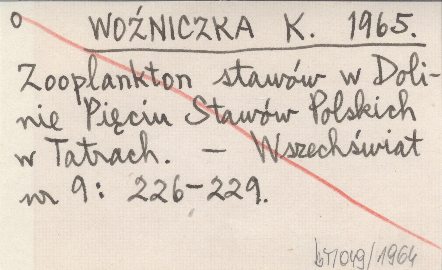 WOŹNICZKA K. 1965 Zooplankton stawów w Dolinie Pięciu Stawów Polskich w Tatrach.
