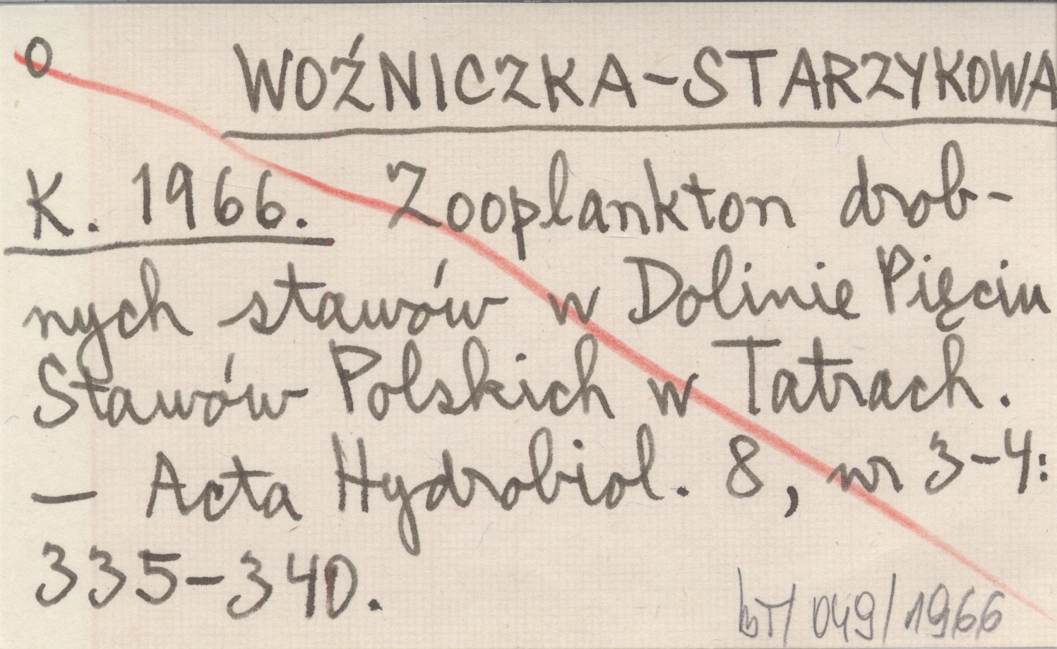 WOŹNICZKA-STARZYKOWA K. 1966 Zooplankton drobnych stawów w Dolinie Pięciu Stawów Polskich w Tatrach.