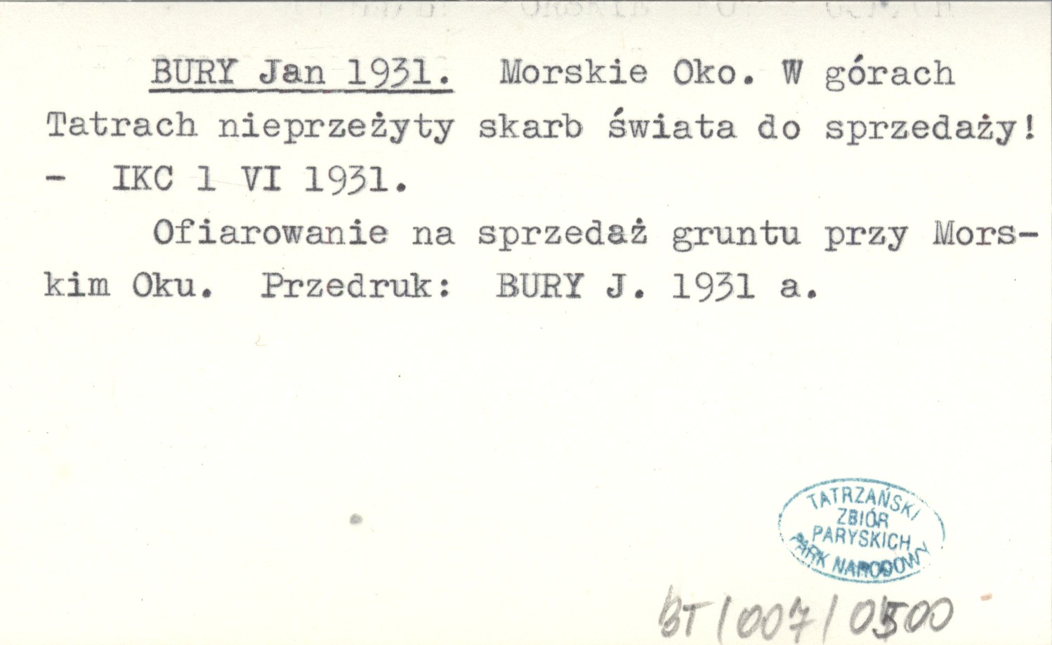Ilustrowany Kuryer Codzienny, 1 VI 1931. Ofiarowanie na sprzedaż gruntu przy Morskim Oku. Przedruk: BURY J. 1931 a