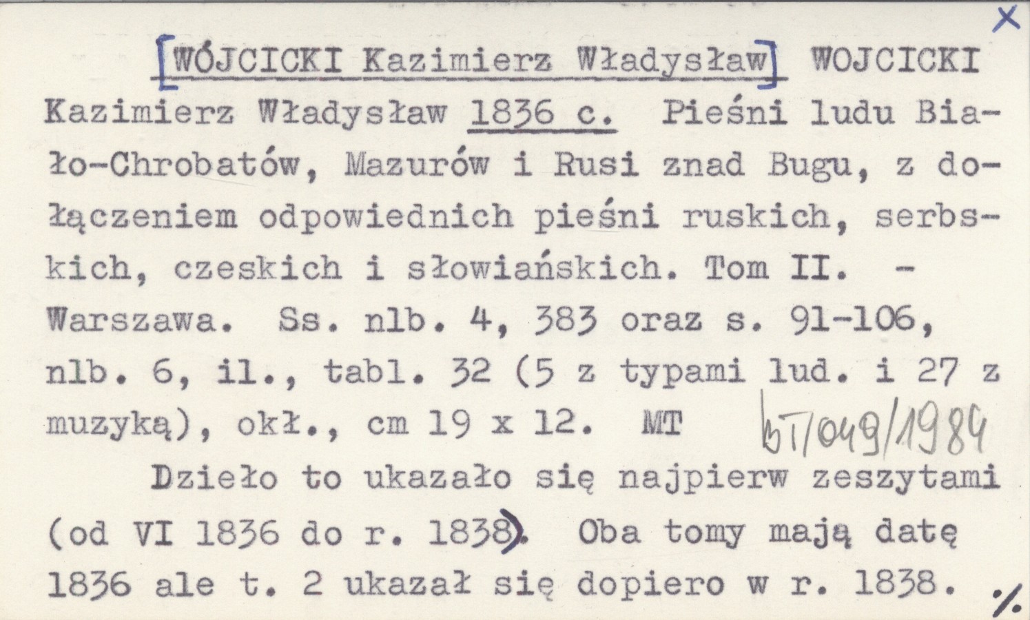 WOJCICKI Kazimierz Władysław [WÓJCICKI Kazimierz Władysław] 1836 c Pieśni ludu Biało-Chrobatów, Mazurów i Rusi znad Bugu, z dołączeniem odpowiednich pieśni ruskich, serbskich, czeskich i słowiańskich. Tom II.